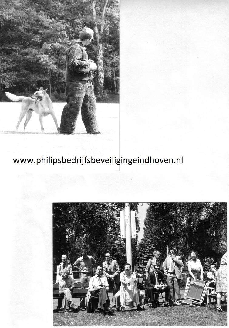 Boven: Theo Bruijnaers (chef honden sectie) met de eerste diensthond van Philips bedrijfsbeveiliging “Leo” in december 1969